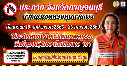 เรื่องประกาศกำหนดเขตควบคุมการเผาในทุกพื้นที่ของจังหวัดกาญจนบุรี เพื่อป้องกันและลดผลกระทบจากปัญหาไฟป่า หมอกควัน และฝุ่นละอองขนาดเล็ก (PM2.5) |