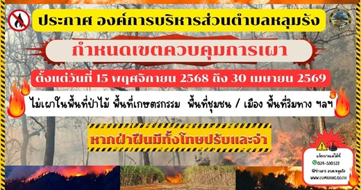 เรื่องประกาศ กำหนดเขตควบคุมการเผา ตั้งแต่วันที่ 15 พฤศจิกายน 2568 ถึง 30 เมษายน 2569 |
